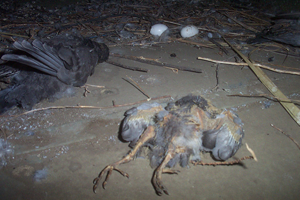 Here you can see some dead birds near the eggs in the attic. They won't hatch unless they are sat on. Unless the attic is hot enough, like an incubator.